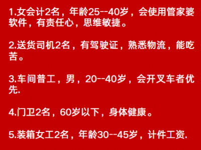 5.装箱女工2名,年龄30--45岁,计件工资.