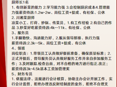 江南水乡生态餐饮招聘:厨师长1名、川湘菜厨师、服务员、领班、务专员,电话13167548032、15803301642(微信同号)地址:邯郸市永年区阳光路西