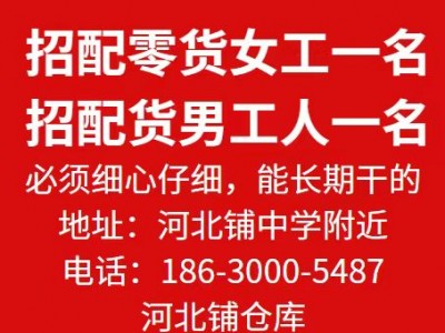 河北铺仓库招配零货女工一名,招配货男工人一名,必须细心仔细,能长期干的。地址河北铺中学附近