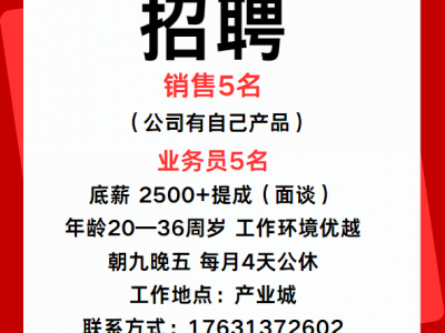 【招聘】本公司招聘销售5名 (公司有自己产品)另招业务员5名底薪 2500+提成(面谈)年龄20—36周岁,工作环境优越。工作地点:产业城,工作时间:朝九晚五 每月4天公休