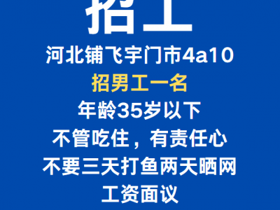 招男工一名,不管吃住,年龄35岁以下。有责任心,不要三天打鱼 两天晒网,工资面议。