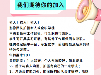 影团像队招人或全职学徒,可全职可兼职,提供稳定接单平台,专业教学,工作地址:北京,学徒期每月6K+,正式员工按单结算或者月结4K-12K+