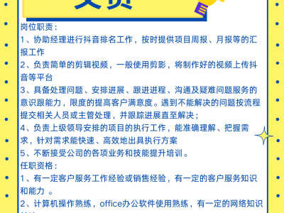 1、协助经理进行抖音排名工作,按时提供项目周报、月报等的汇报工作