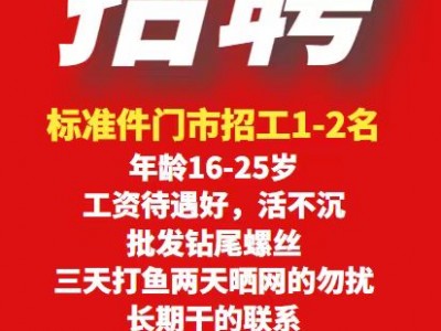 标准件门市招工1-2名,年龄16-25岁,工资待遇好,活不沉,批发钻尾螺丝,三天打鱼 两天晒网的勿扰,长期干的联系