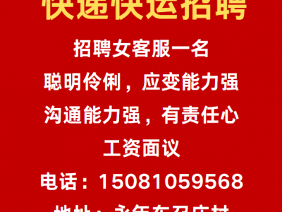 快递快运招聘女客服一名,聪明伶俐,应变能力强,沟通能力强,有责任心,工资面议,地址永年东召庄村