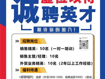 销售经理5名,行政经理2名会计2名销售精英50名。 外贸专员5名英语6级 薪资待遇:底薪3000+50提成+全勤+管饭+4天公休+年终奖。抗震支架销售经验管理经验优先录用
