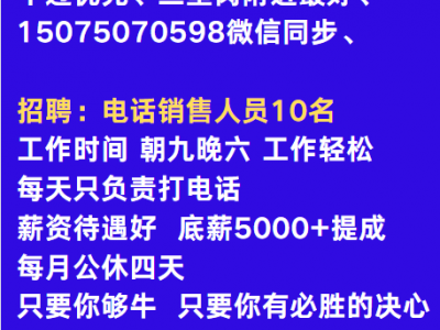 2⃣招聘:电话销售人员10名 工作时间 朝九晚六 工作轻松 每天只负责打电话