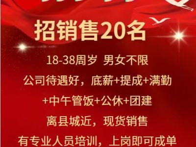 招聘 招销售20名 18-38周岁 男女不限 公司待遇好,底薪+提成+满勤+中午管饭+公休+团建 离县城近,现货销售 有专业人员培训,上岗即可成单 轻轻松松月入过万 地址:永年北东街工业区