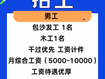 男工: 包沙发工 1名 木工 1名 干过优先 工资计件 月综合工资(5000-10000)工资待遇优厚 有意愿者请联系 地址:小龙马