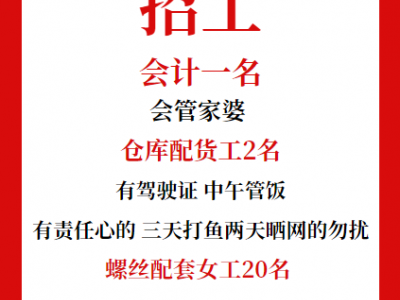 招聘 会计一名,会管家婆,仓库配货工2名,有驾驶证,中午管饭,有责任心的,三天打鱼两天晒网的勿扰,螺丝配套女工20名