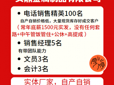 邯郸市久鼎金属制品有限公司:招聘销售人员100名,常年底薪1500元实发,没有任何套路+中午管饭管住+公休+高提成。