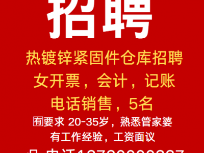 招聘 1⃣热镀锌紧固件 仓库招聘女开票,会计,记账,电话销售,5名 要求 20-35岁,熟悉管家婆 ,有工作经验,工资面议