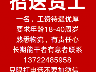 招送货工一名,工资待遇优厚,要求年龄18-40周岁,熟悉物流,有责任心,长期能干者有意者联系,只限打电话不要加微信....