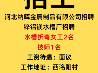 锌铝镁水槽厂招聘水槽折弯女工2名,技师1名