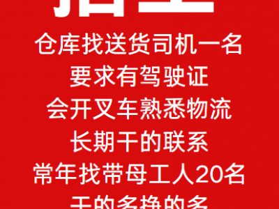 仓库找送货司机一名,要求有驾驶证,会开叉车熟悉物流,长期干的联系