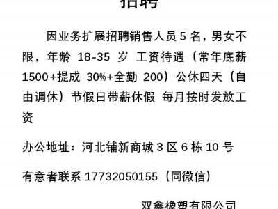 因业务扩展招聘销售人员5名,男女不限,年龄18-35岁 工资待遇(常年底薪1500+提成30%+全勤200)公休四天(自由调休)节假日带薪休假 每月按时发放工资
