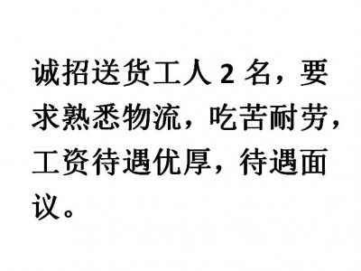 招送货工人2名,要求:熟悉物流,吃苦耐劳,工资待遇优厚,待遇面议,