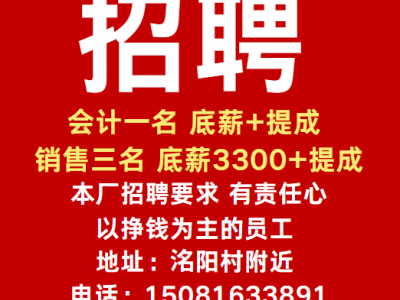 招聘会计一名 底薪+提成 销售三名 底薪3300+提成 本厂招聘要求 有责任心 以挣钱为主的员工 地址:洺阳村附近