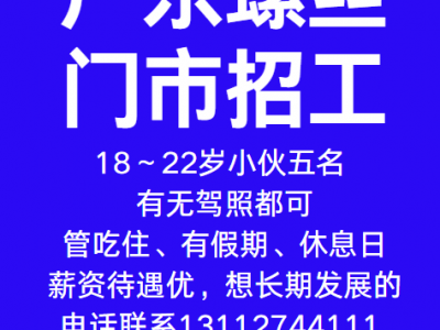 广东螺丝门市招18~22岁小伙五名 有无驾照都可,管吃住、有假期、休息日,薪资待遇优,想长期发展的电话联系 (五倒三晃者勿扰)