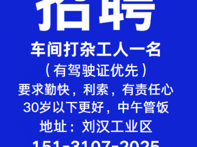 招车间打杂工人一名(有驾驶证优先),要求勤快,利索,有责任心,30岁以下更好,中午管饭