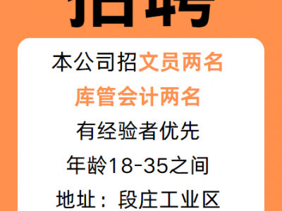 招聘:本公司招文员两名,库管会计两名,有经验者优先,年龄18-35之间。地址段庄工业区