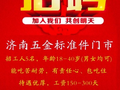 招聘职位:普工/技工 山东济南五金标准件招工3-5名,年龄20-40周岁。包食宿,月薪6000元。要吃苦耐劳有上进心!,非诚勿扰