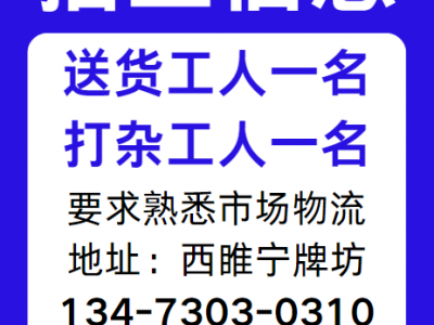 招送货工人一名、打杂工人一名!