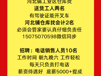 1⃣河北铺工业区仓库找送货工人两名有驾驶证能开叉车**河北铺仓库找会计2名必须会管家婆认真仔细负责任