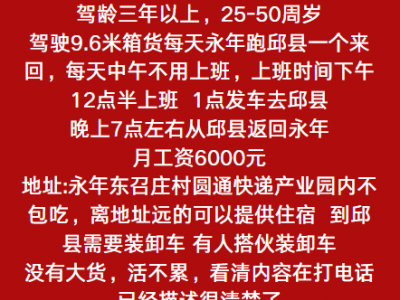 快递公司招聘司机 一名 B本,驾龄三年以上 25-50周岁 驾驶9.6米箱货每天永年跑邱县一个来回,每天中午不用上班,上班时间下午12点半上班 1点发车去邱县 晚上7点左右从邱县返回永年 ,月工资6000元 地址:永年东召庄村圆通快递产业园内, 不包吃, 离地址远的可以提供住宿 ,到邱县需要装卸车 有人搭伙装卸车, 没有大货,活不累,看清内容在打电话,已经描述很清楚了,接受不了装卸车的勿扰,浪费各自时间 再次说下接受不了装卸车的勿扰,