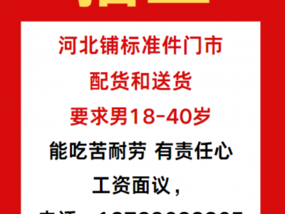 招工河北铺标准件门市配货和送货,要求男18-40,能吃苦耐劳,有责任心,工资面议,