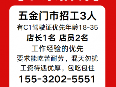 北京,五金门市招工3人,有C1驾驶证优先,年龄18-35岁,店长1名店员2名,工作经验的优先,要求能吃苦耐劳,混天勿扰,工资待遇优厚,包吃包住电话15532025551 15533095552