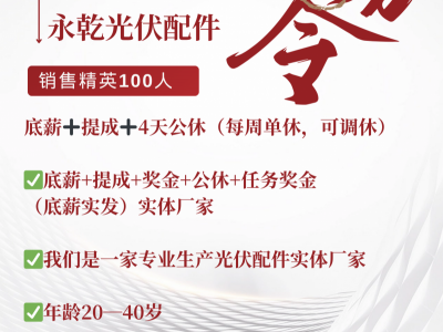 永乾光伏配件因业务扩展招聘销售100人,底薪+提成+奖金+公休4天+任务奖金(底薪实发)(20—40岁)