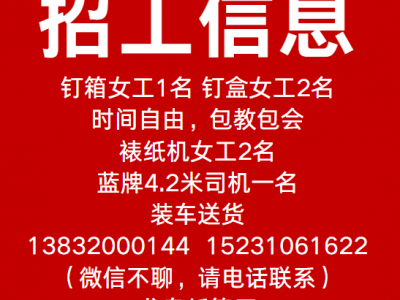 招工:龙泉纸箱厂招钉箱女工1名,钉盒女工2名,时间自由,包教包会。裱纸机女工2名。蓝牌4.2米司机一名,装车送货。电话13832000144 15231061622(微信不聊,请电话联系)
