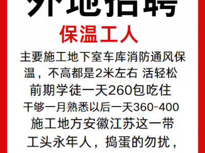 外地招聘保温工人 主要施工地下室车库消防通风保温,不高都是2米左右 活轻松 前期学徒一天260包吃住 干够一月熟悉以后一天360-400 施工地方安徽江苏这一带 工头永年人,捣蛋的勿扰