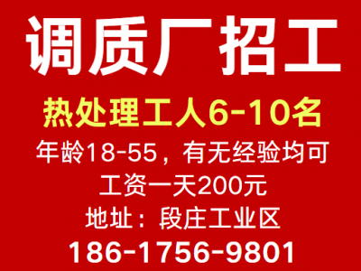 调质厂招热处理工人6-10名,年龄18-55,有无经验均可,工资一天200元。