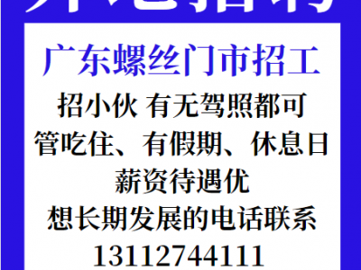 广东螺丝门市招小伙 有无驾照都可,管吃住、有假期、休息日,薪资待遇优,想长期发展的电话联系 (五倒三晃者勿扰)