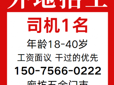 招工:廊坊五金标准门市招工, 司机1名,年龄18-40岁,工资面议。 干过的优先。