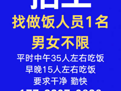 招工:恒创附近工厂找做饭人员1名,男女不限,平时中午35人左右吃饭,早晚15人左右吃饭。要求干净 勤快。
