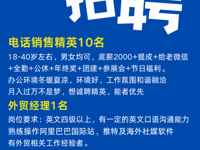 招聘:电话销售精英10名,18-40岁左右,月入过万不是梦;外贸经理1名,英文四级以上,有一定的英文口语沟通能力,无责底薪3K—1W+提成+年终奖+节日福利。