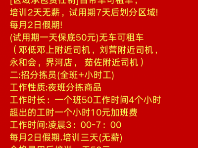 培训2天无薪,试用期7天后划分区域!每月2日假期!