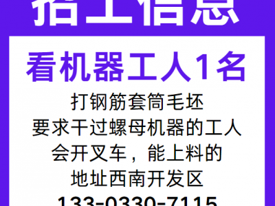 招工,招看机器工人1名,打钢筋套筒毛坯。要求干过螺母机器的工人,会开叉车,能上料的。