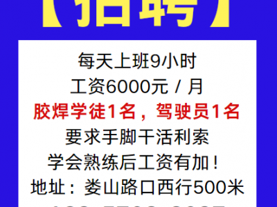 招聘:每天上班9小时,工资6000元/月,胶焊学徒1名,驾驶员1名,要求手脚干活利索,学会熟练后工资有加!地址:娄山路口西行500米