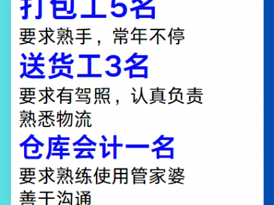 3,仓库会计一名,要求熟练使用管家婆,善于沟通。