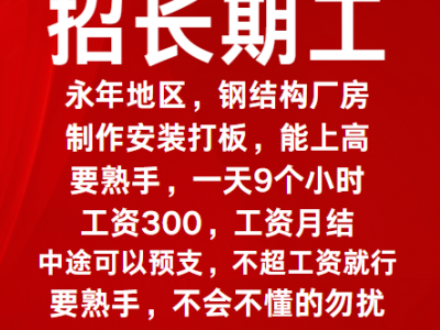 招长期工 永年地区,钢结构厂房,制作安装打板,能上高,要熟手,一天9个小时,工资300,工资月结,中途可以预支,不超工资就行, 要熟手,不会不懂的勿扰 。