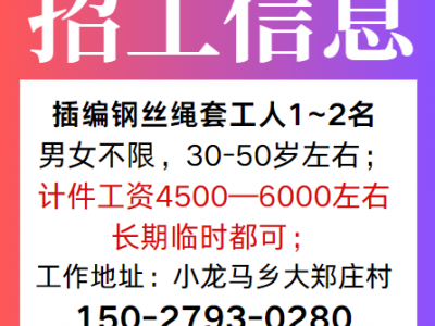 招工:插编钢丝绳套工人1~2名,男女不限,30-50岁左右;