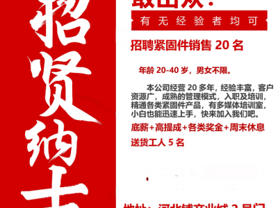 冀标紧固件招聘:紧固件销售20名,20-40岁,底薪+高提成+各类奖金+周末休息,另招送货工人5名 地址:河北铺产业城2号门A6座6楼