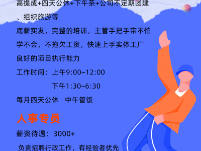 资待遇:底薪2500提成奖金(公司入职两个月以上工资均在7000-15000)上不封顶完整的培训,公司主管手把手教不怕学不会,底薪实发。职业晋升通道,升职五险一金全部提供。高底薪高提成高奖金。