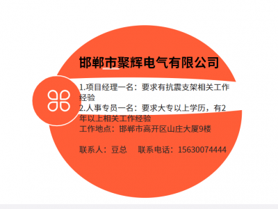 邯郸市聚辉电气有限公司招聘:项目经理一名,要求有抗震支架相关工作经验;人事专员一名,要求大专以上学历,有2年以上相关工作经验;