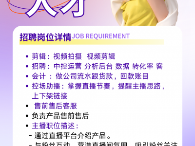 招聘:剪辑、中控运营、会计、控场助播、售前售后客服、主播;底薪5000+高提成, 公休四天 ;团建聚餐 员工旅游、零食下午茶;