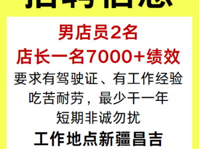 招聘,男店员2名,店长一名7000+绩效。要求有驾驶证、有工作经验,吃苦耐劳,最少干一年。短期非诚勿扰;
